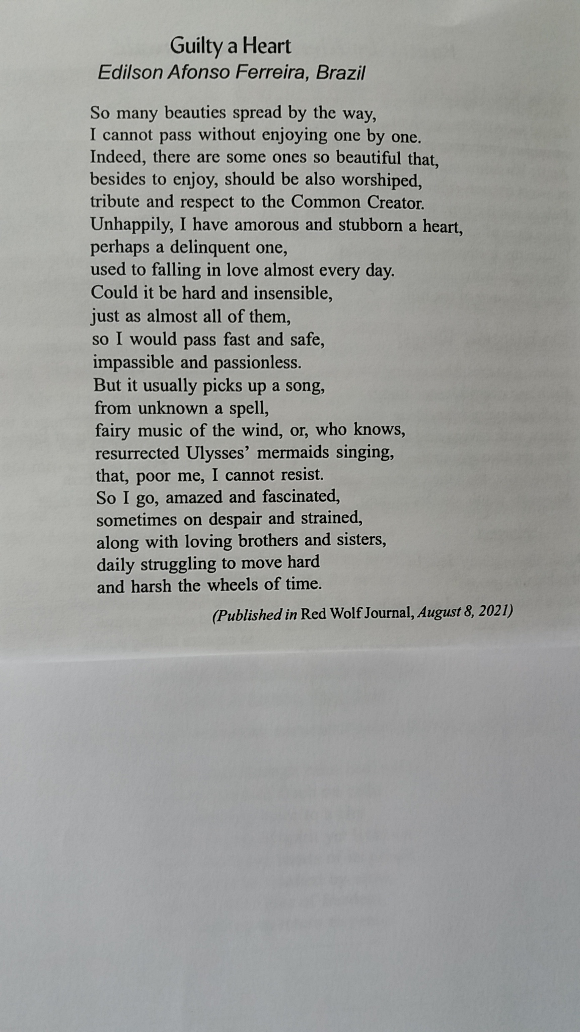 My poem “Guilty a Heart” has been published in the Literary Review West Ward Quarterly, its printed Spring 2022 issue. Many thanks to the dear editor Shirley Anne Leonard.
